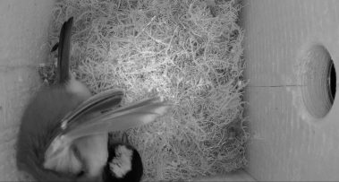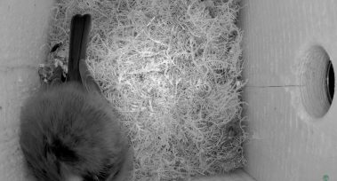 Seit Mitte November hat eine Blaumeise den noch nicht leergeräumten Stiftungskasten als Schlafstätte für die Nacht entdeckt. Sie schläft darin, bis die Sonne aufgeht, und besucht den Kasten im Laufe des Tages mehrmals.