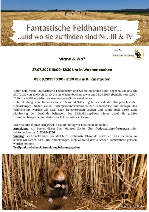 Unter Leitung von Gebietsbetreuer Manfred-Sattler geht es auf die Stoppeläcker der Gemarkungen im Main-Kinzig-Kreis. Neben vielen Hintergrundinformationen zur Lebensweise und Biologie des Feldhamsters werden Sie aktiv nach Hamsterbauen suchen und somit auch direkt zum Monitoring der Bestände beitragen. Der Main-Kinzig-Kreis bietet dabei die größte zusammenhängende Population des Feldhamsters in Hessen. Interessierte können sich jeweils bis zum Freitag vor Exkursion anmelden.