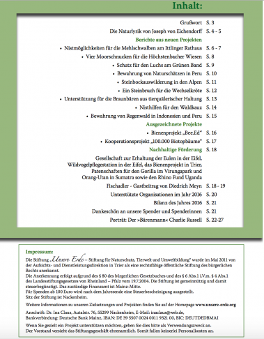 Hier können Sie sich eine Vorschau des Stiftungsjournales ansehen. Wenn Sie das Stiftungsjournal komplett lesen möchten, bestellen Sie es bitte gegen einen kleinen Unkostenbeitrag von 5,00 €. Sie erhalten postalisch die aktuelle Ausgabe zugesendet. Der Erlös fließt zu 100% in die Stiftung ein. Hier können Sie bestellen…